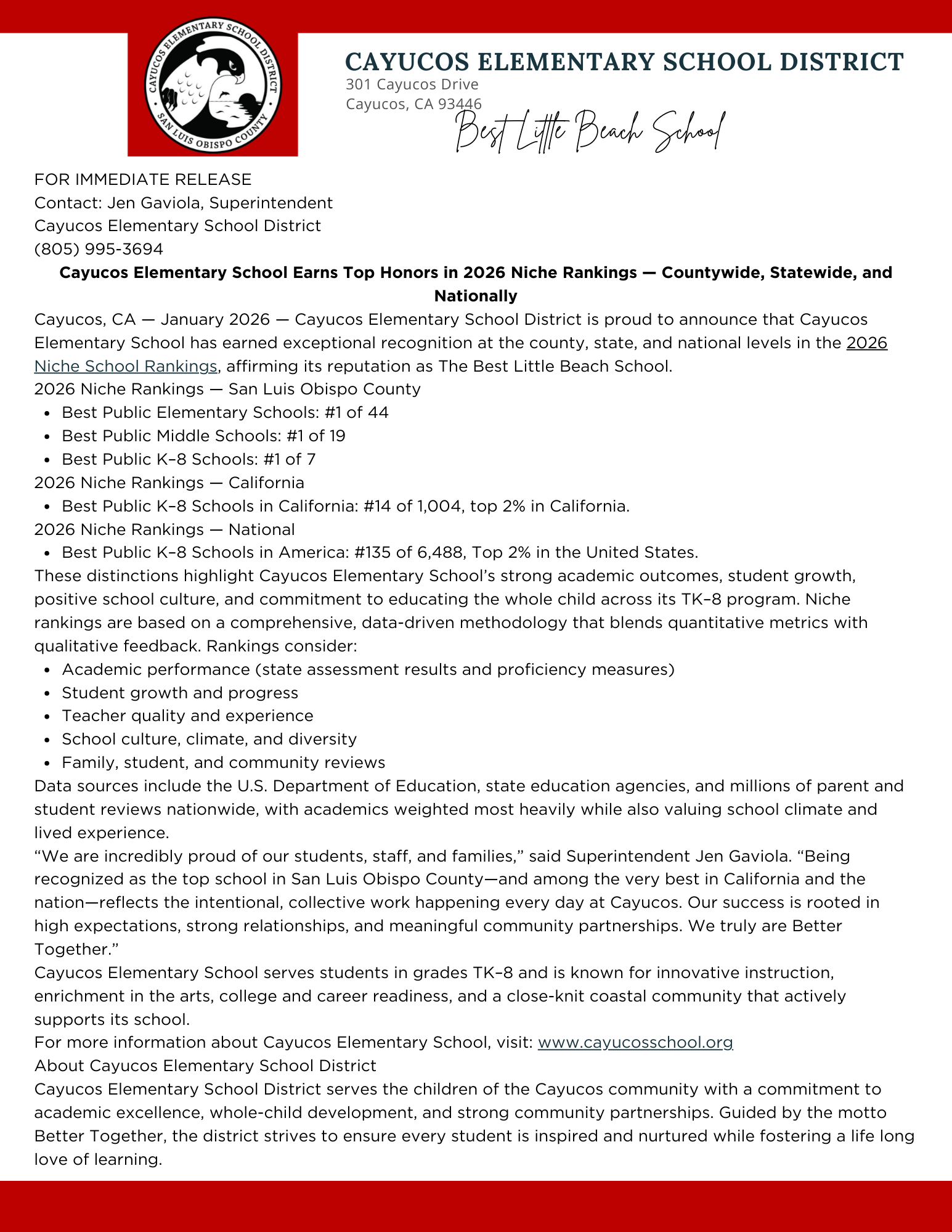 Cayucos, CA — January 2026 — Cayucos Elementary School District is proud to announce that Cayucos Elementary School has earned exceptional recognition at the county, state, and national levels in the 2026 Niche School Rankings, affirming its reputation as The Best Little Beach School. 2026 Niche Rankings — San Luis Obispo County
